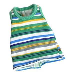 • A striped tank top featuring horizontal stripes in green, white, yellow, blue, and gray, with a green trim around the neck and arms.