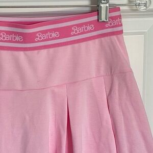 Elastic stretchy waistband with the Barbie logo around the waist. Built-in stretchy polyester shorts. Pleated skirt. Resort wear. Preppy. Athleisure. Athletic. Tennis.