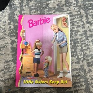 Barbie book with a pink cover. Features a playful scene with dolls.