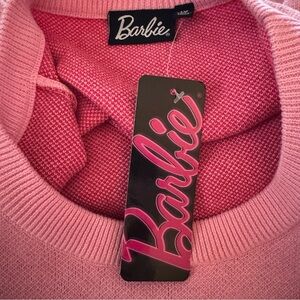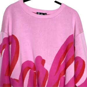 Add a fun pop of color with this Barbie pink crew-neck sweater, size 1X. Featuring the iconic Barbie logo across the chest, this cozy knit is perfect for layering or gifting.