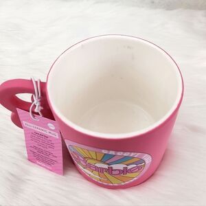 This is a fun and pink Barbie coffee mug with groovy vibes and a handle in the shape of the B from the Barbie logo