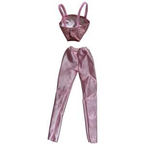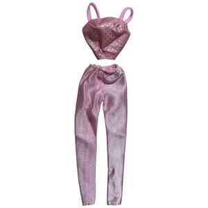 Barbie is about to serve absolute main character energy in this ridiculously gorgeous pink metallic two piece set that screams confidence and style all at once. This coordinating outfit features a flattering crop top with those cute adjustable straps and an allover sequin scatter pattern that adds major sparkle without being over the top, paired perfectly with sleek slim fit pants in that beautiful ribbed metallic fabric that catches every bit of light creating this liquid mercury effect in the most stunning rose pink shade. The high waisted pant silhouette elongates beautifully while that textured horizontal rib knit gives dimension and visual interest making this way more elevated than your standard doll clothing. That crop top hits at just the right spot showing a tasteful sliver of midriff giving modern athleisure meets glam vibes perfect for concert scenes workout moments or just casual daytime looks that still feel put together