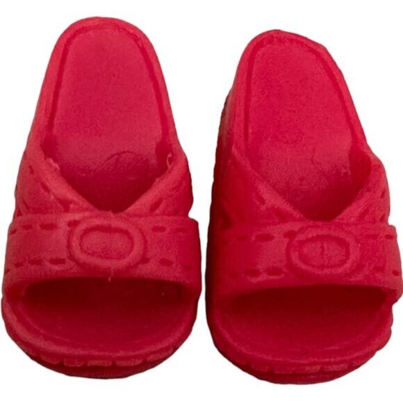 These miniature pink slide sandals are a charming addition to any Barbie doll's wardrobe. Featuring an open-toe design and intricate detailing, they showcase a playful yet practical style for imaginative play. Their vibrant hue and slip-on convenience make them a standout accessory for doll enthusiasts and collectors alike.