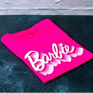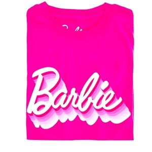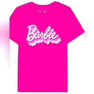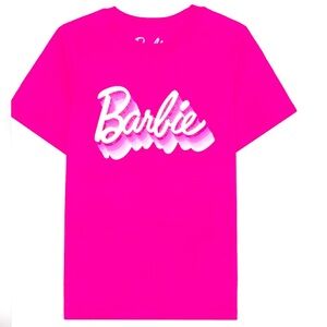 Stylish Barbie tee in vibrant fuchsia with white Barbie Script, enhanced with glitter. Matte pink to white ombré finish. Stylish, Soft & Comfy ready for school!