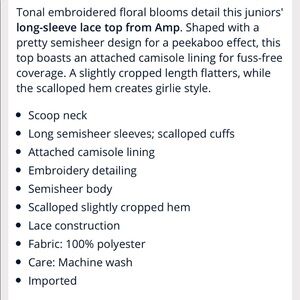 Scoop neck, long semisheer sleeves with scalloped cuffs, attached camisole lining, embroidery detailing, semisheer body, scalloped slightly cropped hem, lace construction. Imported. Machine wash. 100% polyester.