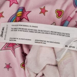 Adorable pink kids dress featuring a fun Barbie rainbow and heart print. Perfect for any occasion.