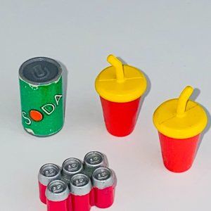2 matching cups with straws and a green can of soda, stand 3/4" tall.