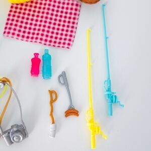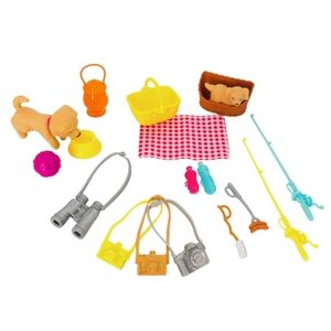Plastic dogs and doll accessories with picnic, camping, and fishing outdoors themes (Lot is a mixture from several Barbie sets with a few pieces from other brands).