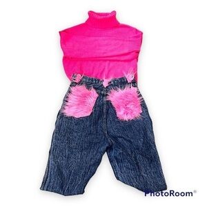 Outfit bundle includes a Barbie turtleneck and upcycled vintage acid wash jeans with pink fur trim. Shades and earrings are not included. Not sold separately.