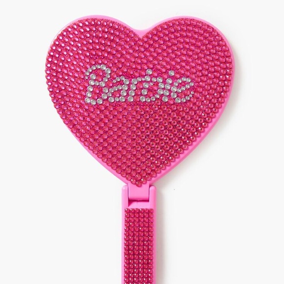A foldable hand mirror that features allover rhinestone embellishments, a heart shape, and "Barbie" text.