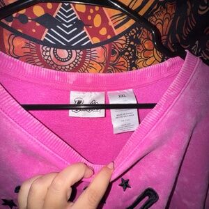 Size: XXL Very cute, comfy, barbie sweatshirt, no flaws Perfect condition Pink color is pretty much as shown