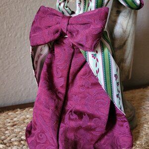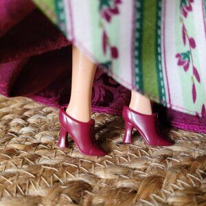 "In keeping with the traditions of the late 1800s, Barbie doll wears a modest long sleeved, floor-length daytime dress. A fashionable hat and full bow enhance the handsome ensemble with its calico printed underskirt."