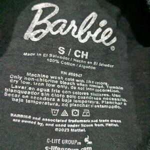 Fun and stylish black short-sleeve t-shirt featuring a Barbie Dream Car graphic print. Made from 100% cotton for a soft, comfortable fit. Perfect for any Barbie fan, this tee adds a touch of nostalgic charm. Measures approximately 17.5 inches armpit to armpit and 25 inches from center back of neck to bottom hem. Pre-owned. Machine wash.