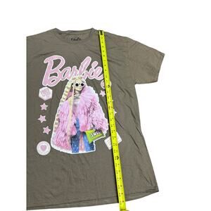 Channel your inner doll style with this Barbie women’s graphic tee in size Large. This olive-brown t-shirt features a bold retro-inspired Barbie logo in pink with star accents and a large central Barbie doll graphic in a chic pink faux-fur coat. Perfect for Barbie fans, Y2K pop culture collectors, or anyone loving vintage-style statement tees.