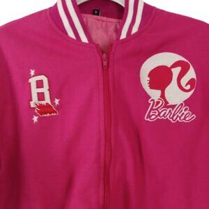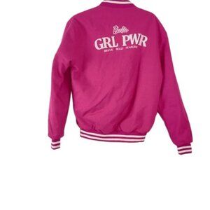 Barbie Womens Zip Bomber Varsity Jacket Pink Girl Power Embroidered Pockets JR S