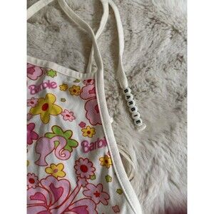 This Barbie X Forever 21 crop top is a vibrant pink and white floral halter style with beaded Barbie spell out accents. Made of a comfortable cotton blend with spandex, it features a tie closure and a sleeveless design. The top has a playful Barbie theme and is suitable for various occasions like travel, parties, or casual wear. In a size medium, it is lightweight, stretchy, and breathable, making it suitable for all seasons. Top is in new with tag condition. Rough measurements in photos. I appreciate your business and strive for a five star rating. Please feel free to message me with questions.