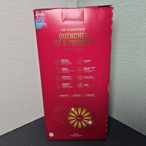 Stay hydrated in style with this red and gold Barbie x Stanley Quencher H2.0 Tumbler. The set includes a tumbler and straw, perfect for enjoying your favorite beverages on the go. The vibrant design adds a fun touch to your daily routine. Whether you're at home or on the move, this drinkware set is a must-have for any Barbie fan.