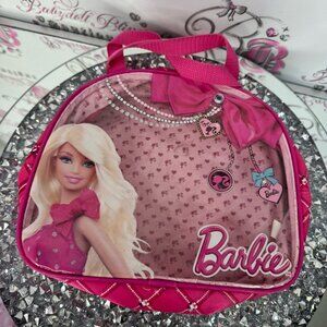 Chic Barbie cosmetic bag with playful pink design. Features iconic Barbie graphics and bow detail. Clear. Small bag.