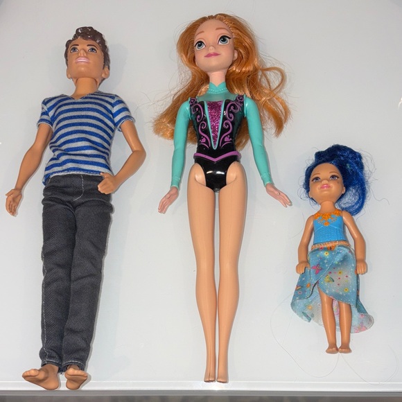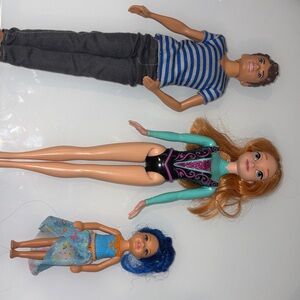 Set of three Barbie dolls. Includes a male doll in a blue striped shirt and black pants. Female doll in a teal and black leotard. Small doll with blue hair and floral skirt.