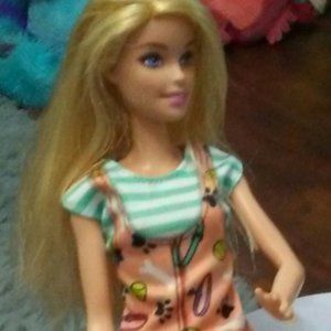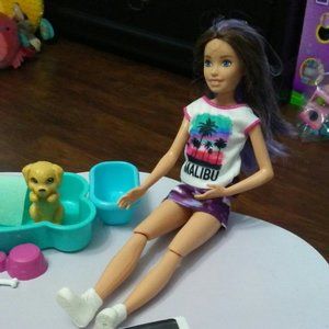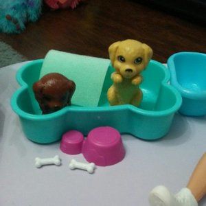 Barbie doll and DVD set includes DVD Barbie and her Sisters in the Great Puppy Adventure, Barbie doll wearing a puppy print jumper, Skipper doll, 2 puppies, towel, dog carrier, dog bed, dog bones and a bathtub.