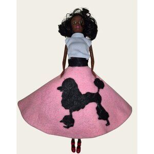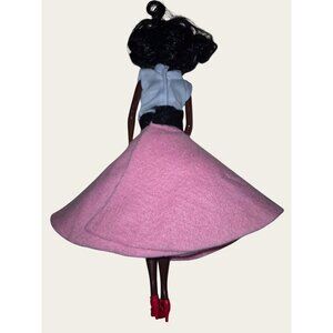 This doll is a nostalgic representation of 1950s fashion, featuring a pink poodle skirt, white top, and red shoes. Ideal for collectors or display.