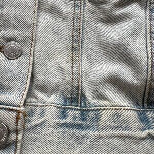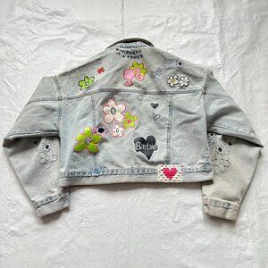 Forever 21 x Barbie trucker jacket, light wash denim with painted flowers and patches, crocheted heart, cropped length, button front, pocket flaps, junior's medium, pit to pit: 21", length: 18", preowned and has spots/stains throughout - see photos