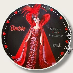 This limited edition Barbie Queen of Hearts plate, made by ENESCO and signed by Bob Mackie, is a highly sought-after collector’s item. Released in 1995 as the first in a series exclusively for JCPenney, only 7,500 of these plates were produced. This plate features a stunning illustration of Barbie in a red, sequined gown with feathered headgear, set against a black background adorned with red hearts and white accents.