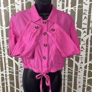 American Eagle Outfitters Bubblegum Pink Linen Blend Barbiecore Pullover Shacket. Features slight cropped fit, fully functional large front buttons but the elastic at the bottom doesn't open (this is a pullover style), faux tie ribbon accent on front waistband, single button closure at cuffs, long sleeves, square front chest pockets, lightweight breathable linen blend. Gently worn and laundered with some very light wash wear but no flaws to note. This does have a slight nubby texture to the fabric which is characteristic of linen (see last pic). See pics for measurements. This is a great topper to throw on over a maxi dress or in lieu of a sweatshirt - perfect Barbiecore piece!