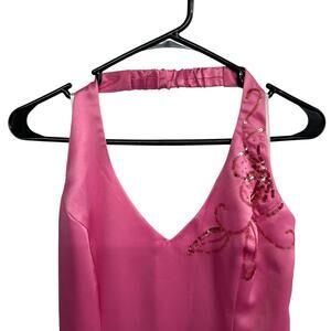 barbiecore, Y2K formal, hot pink gown, sequin floral, lace-up back, corset dress, halter neck, prom dress, party gown, sweetheart glam, vintage junior formal, pageant style
