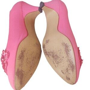 Interiors of the shoes are clean. These have been very gently used and come with their original plastic storage bags (not shown. They are clear.) Bottoms have scuffing from one wearing on a hardwood floor. Small area of very light staining but not noticeable when worn. Shown circled in the photos.
