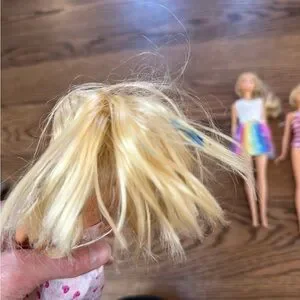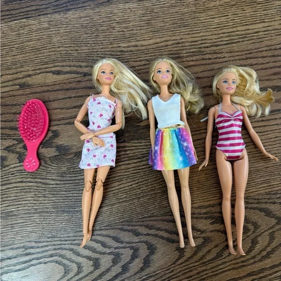 3 Barbie’s and a brush. All have been played with, hair shows this. One has blue stuff in it, no idea what it is and did not try to remove it. One Barbie has elbows and knees that bend. Fair condition.