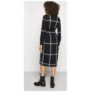 Build out your black and white selections with a cotton-forward sweater dress, sash tied and patterned in a simple grid.