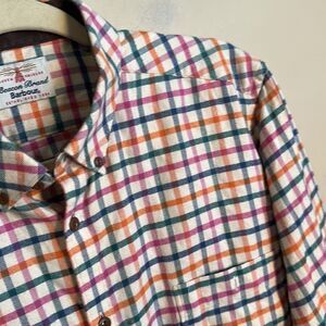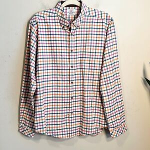 Plaid button down collared shirt with elbow patches and full button in VGUC.