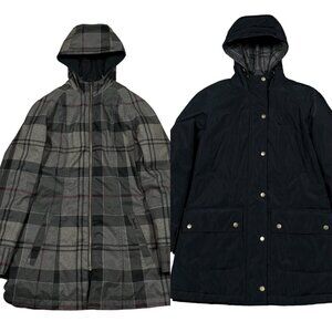 Stylish Barbour jackets. One features a black design with button details. The other showcases a gray plaid pattern. Both have hoods for added protection.