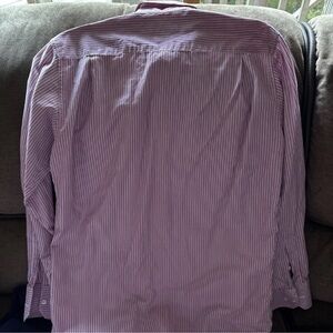 Worn once mens medium reg fit button down red blue ans white striped shirt long sleeve pit yo pit is 21”