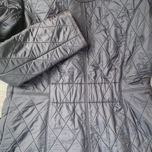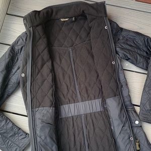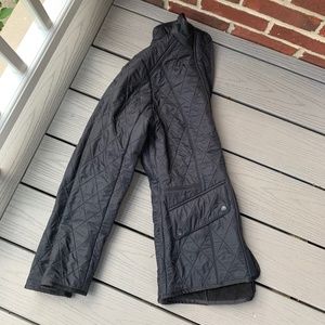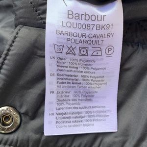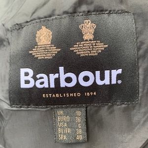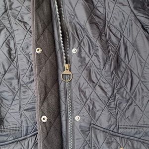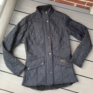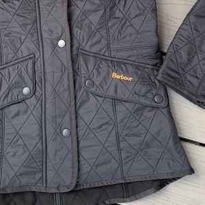 Equestrian-inspired quilted jacket with a cozy fleece lining from Barbour!! Features a diamond quilted pattern, stand collar, front two-way zip closure with outer snap placket, front snap-flap pockets, interior pocket, elasticized waist inset, slightly longer tapered back, cozy fleece lining and made from easy care 100% polyamide. Approx measurements: 26" length with an extra 2+ inches in back, 19" under arm to under arm, 23.5" sleeve length, 16" waist to waist. New condition, as pictured. Black. Size 6. Firm price!