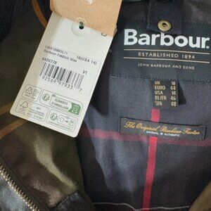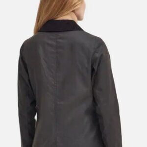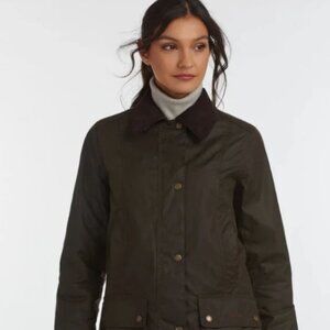 a classic, durable, and waterproof jacket designed for women. It features Barbour's signature waxed cotton shell, a plush corduroy collar, tartan lining, and multiple pockets, including a classic four-pocket design. The coat has a two-way front-zip closure with a snap placket, a back vent, and a contemporary fitted sleeve design, making it a versatile choice for both country and city wear