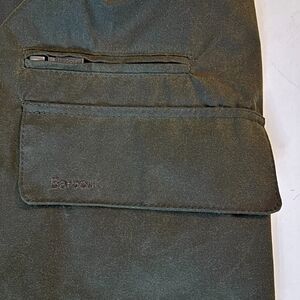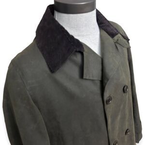 This is a brand new, New Without Tags (NWOT) men's Barbour Icons Haydon Waxed Double-Breasted Coat in Olive, size Medium. The coat is in perfect, unworn condition with no flaws and includes the original replacement buttons still in the bag.