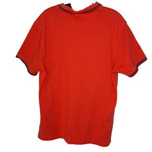 This Barbour International polo shirt features a classic design with a vibrant hue--the color is a bit hard to describe. I think it's a bright pinky orange. AI says red, but I don't think it looks red. Either way, it's BRIGHT. Noone is going to lose you in a crowd when you're wearing this shirt. It is crafted from 100% cotton for breathable comfort. The striped collar and sleeve accents enhance its stylish appeal.