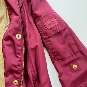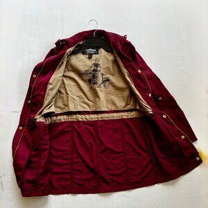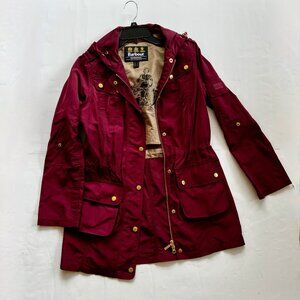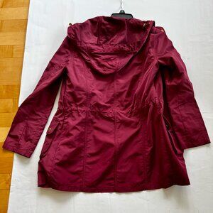 Light polyester, adjustable cinched waist, hooded jacket in red