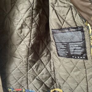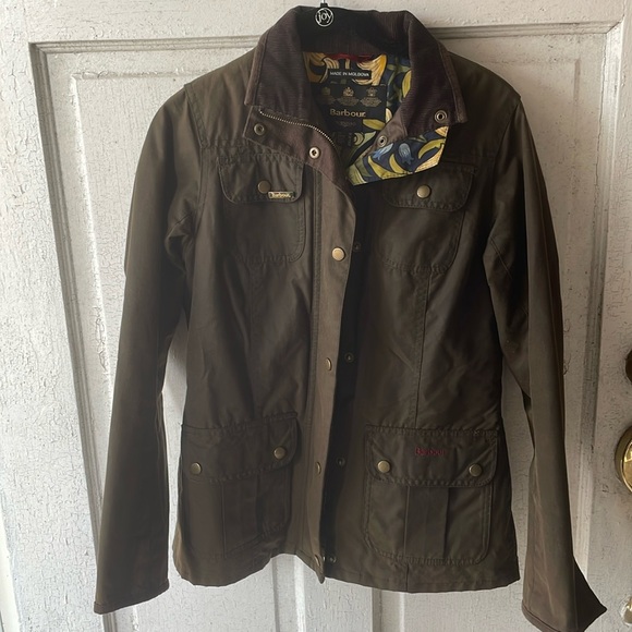 Beautiful used Barbour jacket in good condition! Corduroy collar with floral pattern inside. Zipper and button up. Quilted inside.
