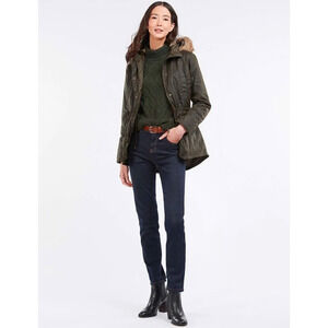 Stay stylish and weather-ready with this Barbour Kelsall Waxed Cotton Coat in classic olive green. Crafted with Barbour's signature waxed exterior, this coat features a faux-fur trimmed hood, a flattering belted waist, and a cozy tartan-lined interior. Designed for both countryside and city wear, it's the perfect mix of practicality and British heritage style.