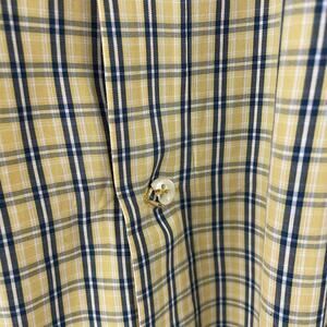 • Features: Long sleeve, Button down, Collared, Yellow navy and white plaid, Pocket on front, Part of the bottom button is cracked (see 2nd photo)