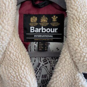 This Barbour International Coat is a vintage-inspired black jacket made of cotton canvas with faux sheepskin accents. The jacket can be dressed up or down, ideal for adding a touch of edgy flair to your outfit.