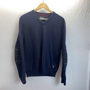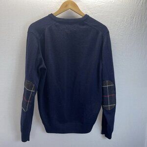 Barbour Men's Navy Blue v neck Cashmere wool Elbow Patch Tartan size Med