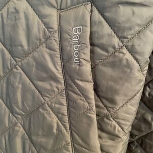 Circa 2017 Barbour quilted Pod Jacket in OD Green, men’s size medium. 100% poly exterior, interior and fill. Blaze orange interior. YKK double-zip closure. Exterior slash pockets at hips, snap pocket at chest. Interior patch pockets at hips, Velcro pocket at lower left. Snap vents at hips.