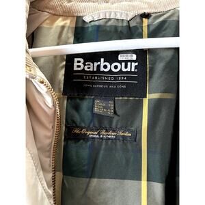 This quilted jacket from Barbour offers a classic and comfortable look with its corduroy collar and gold-tone hardware. Ideal for a casual yet polished style, it pairs effortlessly with a turtleneck and plaid skirt, and can be finished with knee-high boots for a cohesive outfit.