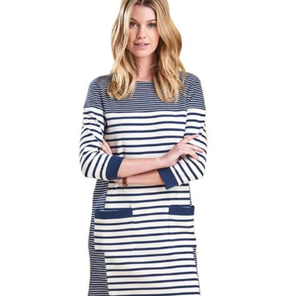 Upgrade your wardrobe with this chic striped tunic dress, designed for comfort and style. This versatile piece features a classic navy and white stripe pattern that adds a nautical touch to your outfit. This Barbour dress has a relaxed and nautical look that is enhanced by the wide boat neckline and 3/4 sleeves. Key features include: