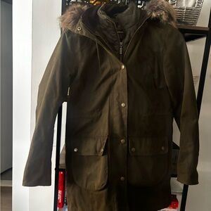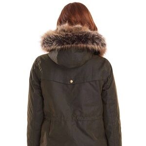 Barbour Olive Thrunton Faux Fur-Trim Waxed Cotton Jacket (size US 4)
