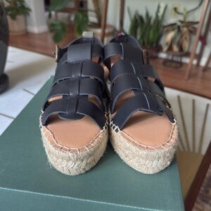 Features: Slip-on style, leather uppers, strappy design, open toe, adjustable buckle strap, woven jute flatform sole, cork footbed